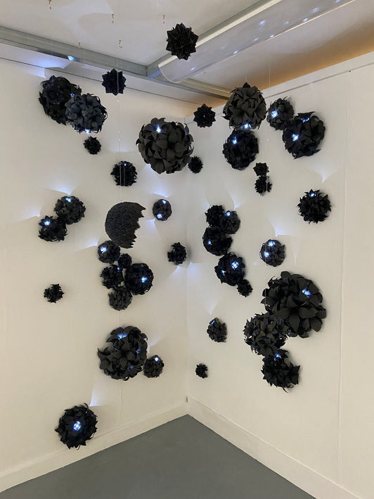 The Dark Kusudama Universe is an immersive origami installation originating from the previous work 'The Kusudama System'. The idea of how fragile an object can be combined with the time revolving around the hidden threats tampering with nature can cause. Utilizing origami to produce a variety of sculptural forms addressing the beauty and threat of nature. The spherical imagery combined with the composition of my work broadens our perception of nature in the sense it is the physical world or universe, playing with micro and macro scales.
